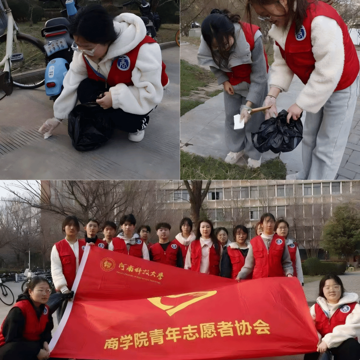 活动现场,志愿者们分工明确、协作有序,分组推进校园与社区两处的清洁任务。在校园内,志愿者们按预先划定的责任区域,对宿舍楼周边、道路、绿化带及停车区等公共区域开展“地毯式”清洁,捡拾隐蔽杂物、清扫路面浮尘,规范乱停放的共享单车,为校园环境“提质增颜”;在龙翔社区,志愿者们手持扫帚、垃圾夹、铲刀、抹布等清洁工具分组工作,全面清扫公共区域的落叶杂物与卫生死角,同步清除墙面及公共设施上的违规小广告,切实优化了社区人居环境,赢得了社区居民的一致好评。