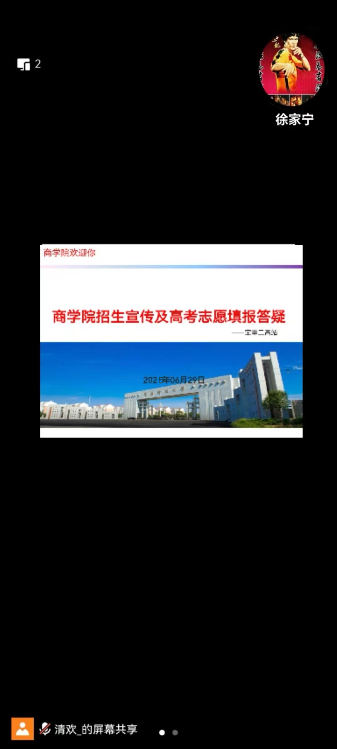 6月29日,商学院以线上腾讯会议的形式与宝丰县第二高级中学开展优质生源基地维护暨高考志愿填报答疑活动。学院党委副书记徐家宁,本科生辅导员汤怡莹、叶尔森、孟安琪,宝丰县第二高级中学校长王东阳、宝丰县二高副校长楚华阳、高三年级主任赵东红、高三任课老师段老师出席线上宣讲会,部分学生及学生家长参加宣讲会。